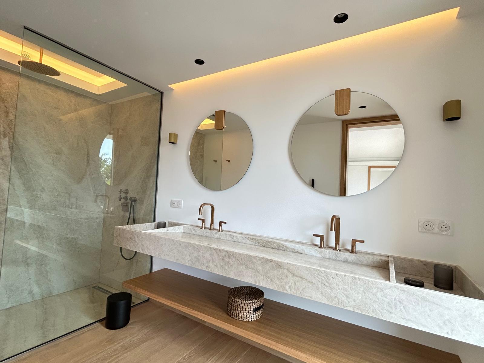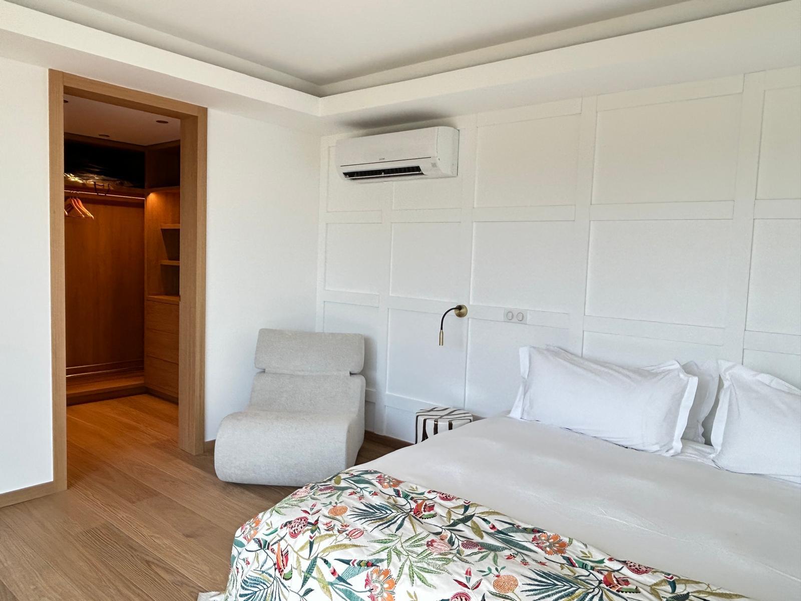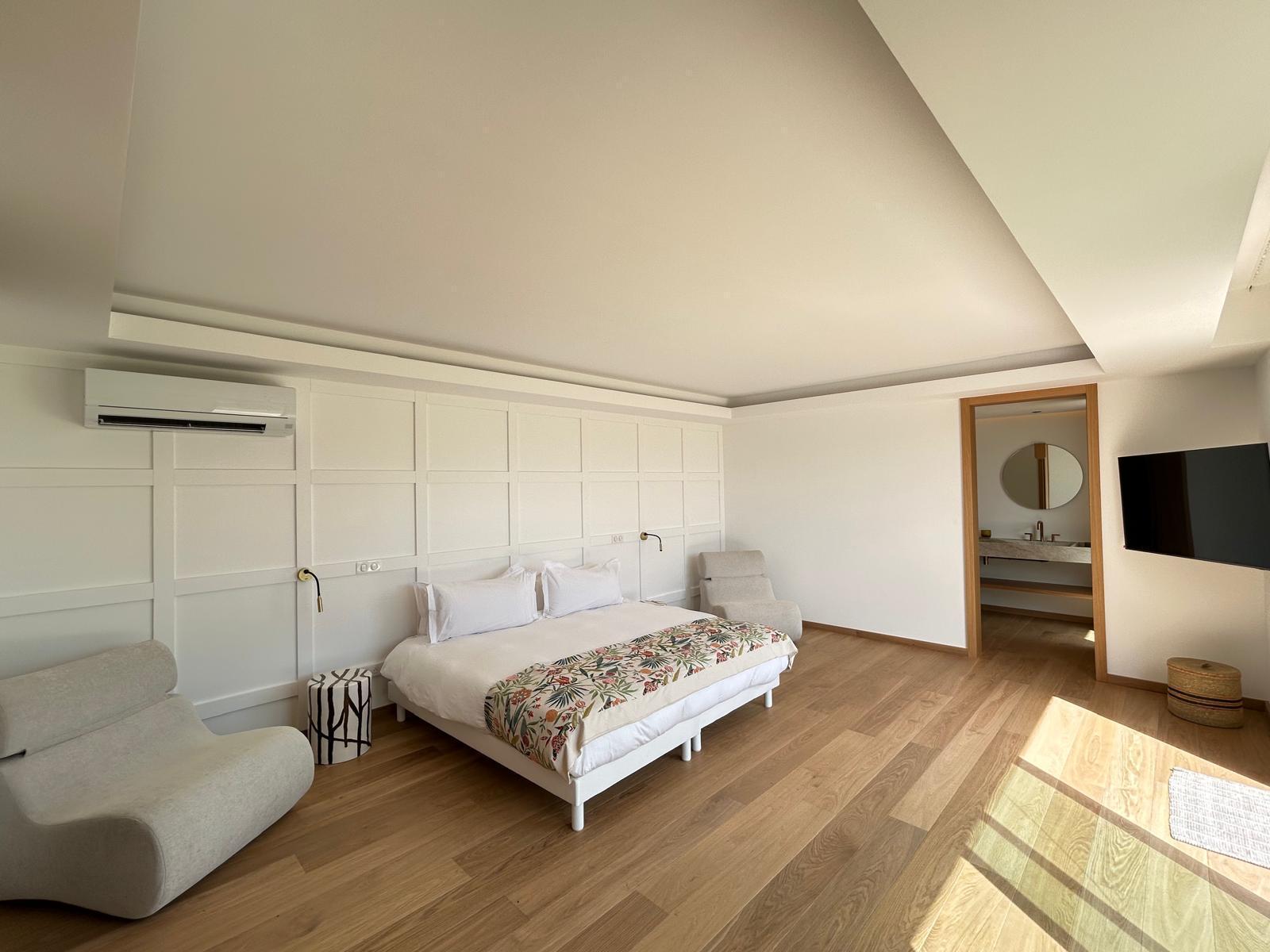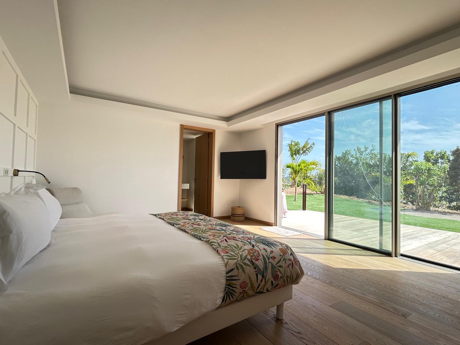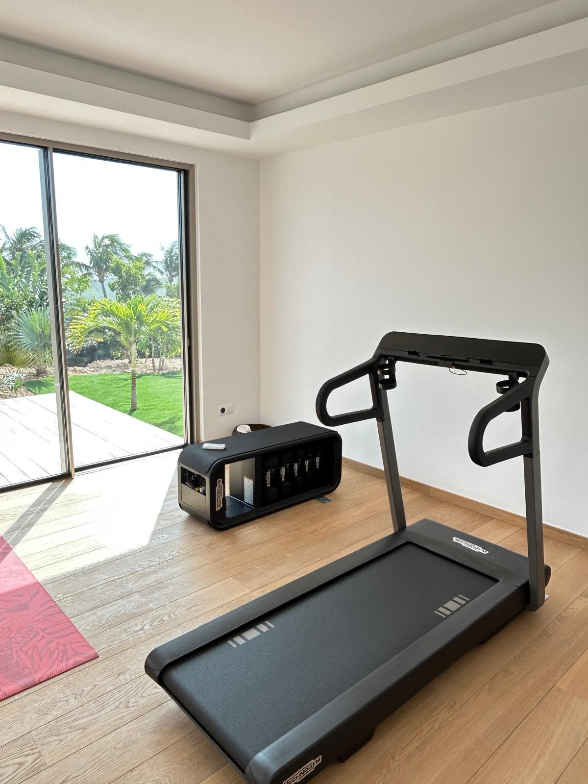 Composta por uma ampla área externa, uma sala de estar totalmente climatizada e uma piscina, possui 3 quartos com acesso pelo terraço, além de um no piso inferior, um quarto infantil e uma sala de ginástica.
