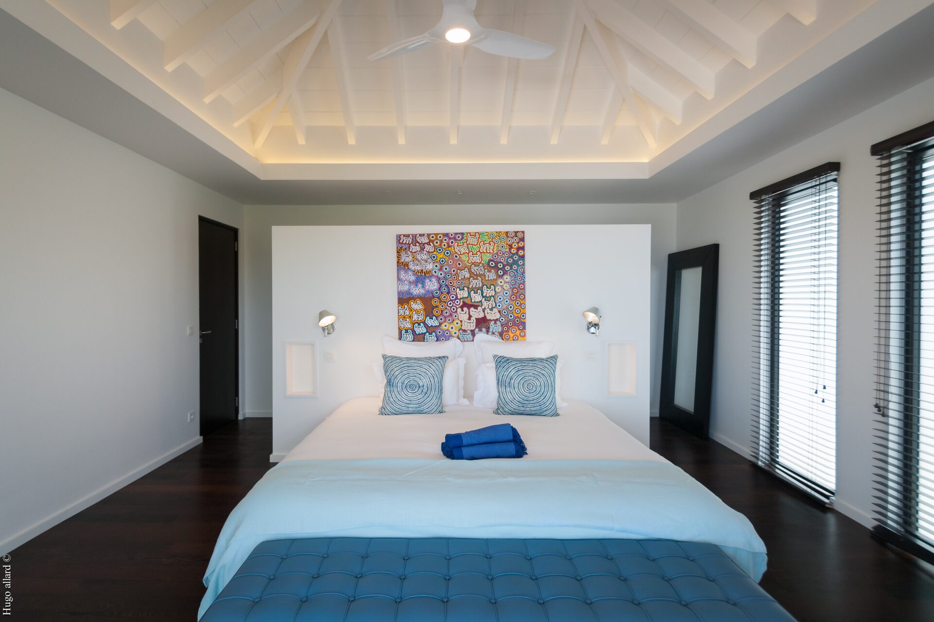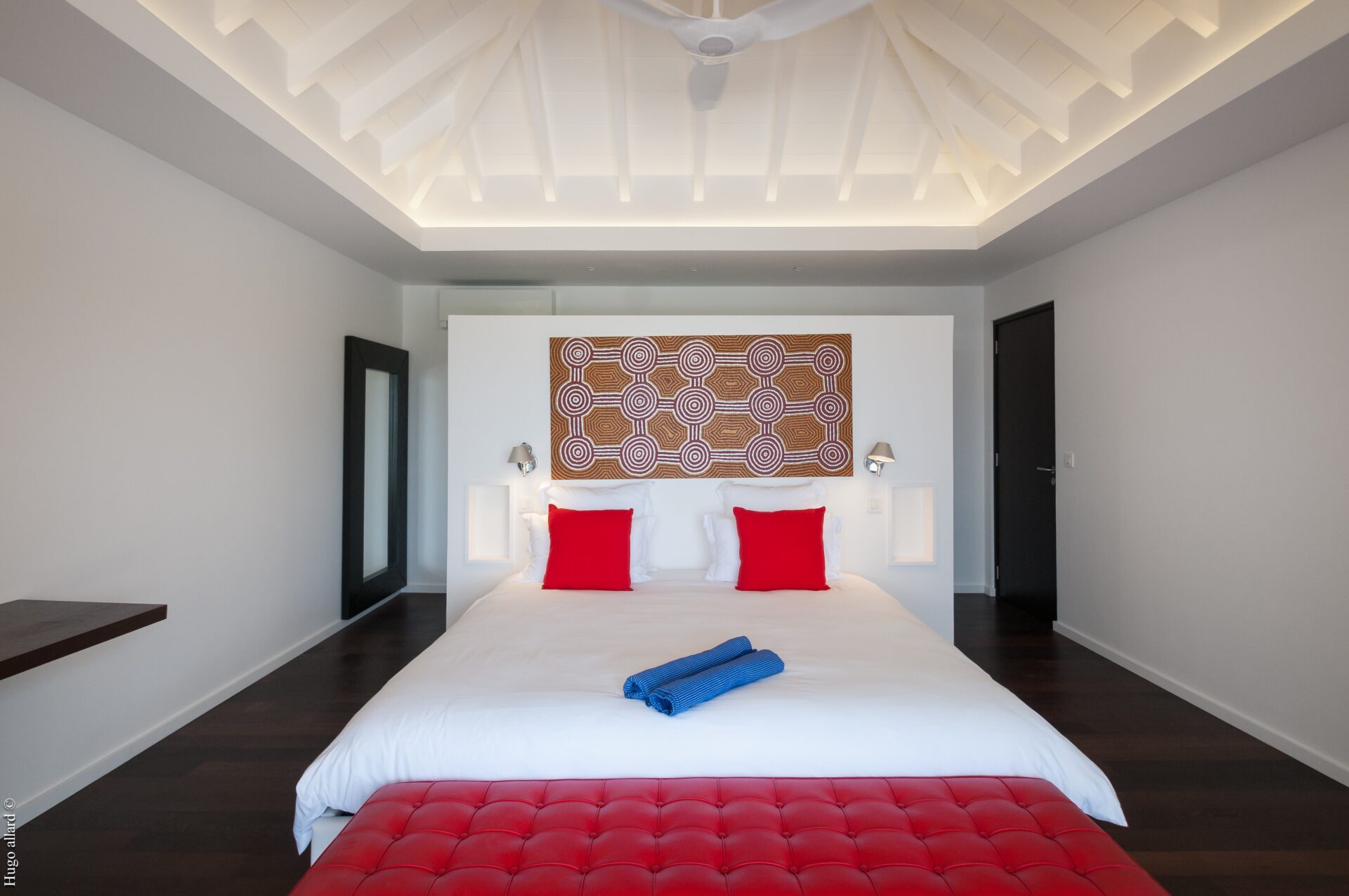 Dois quartos estão ligados a cada lado do salão, e outros dois têm acesso pelo terraço (um em um bangalô separado).