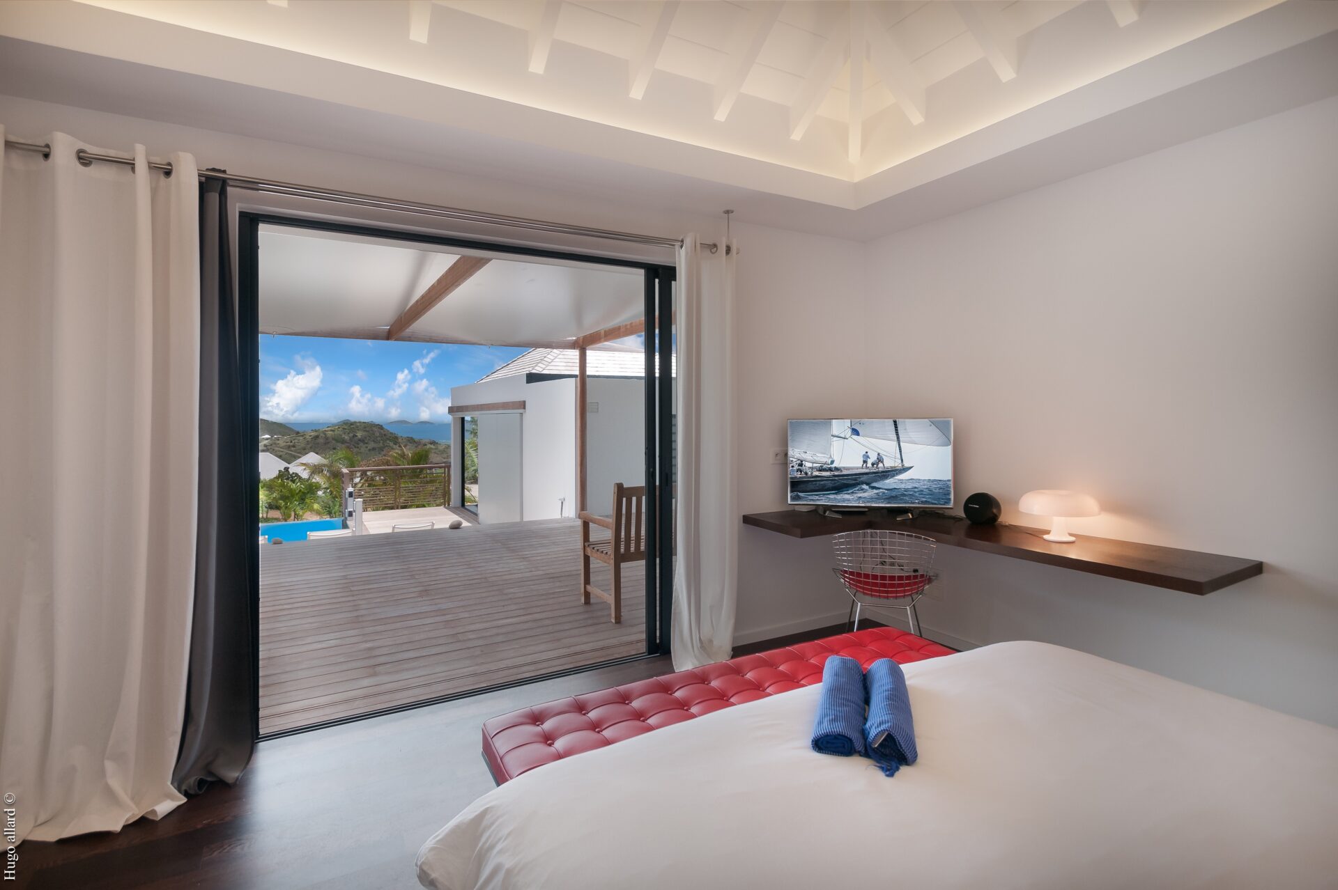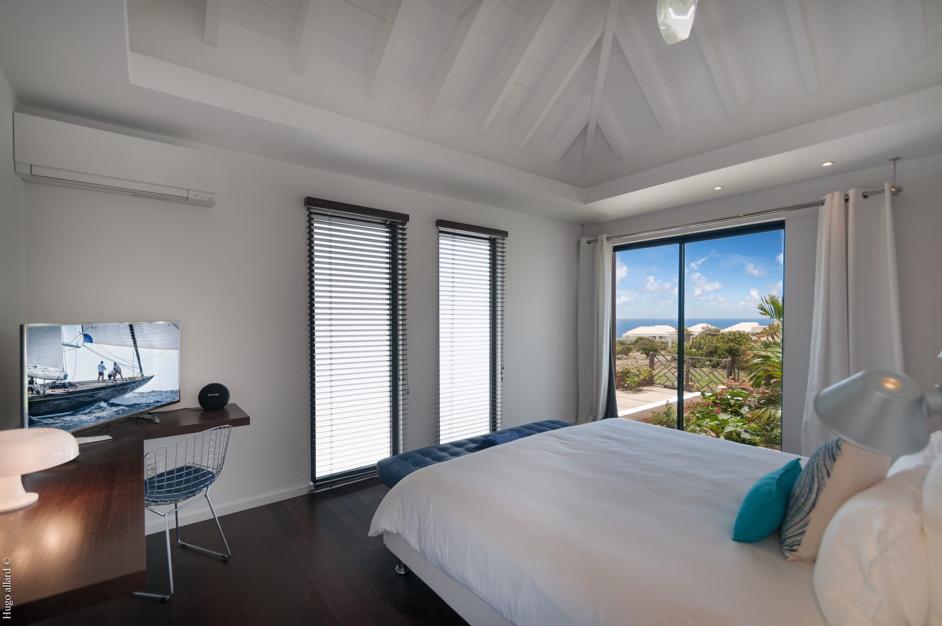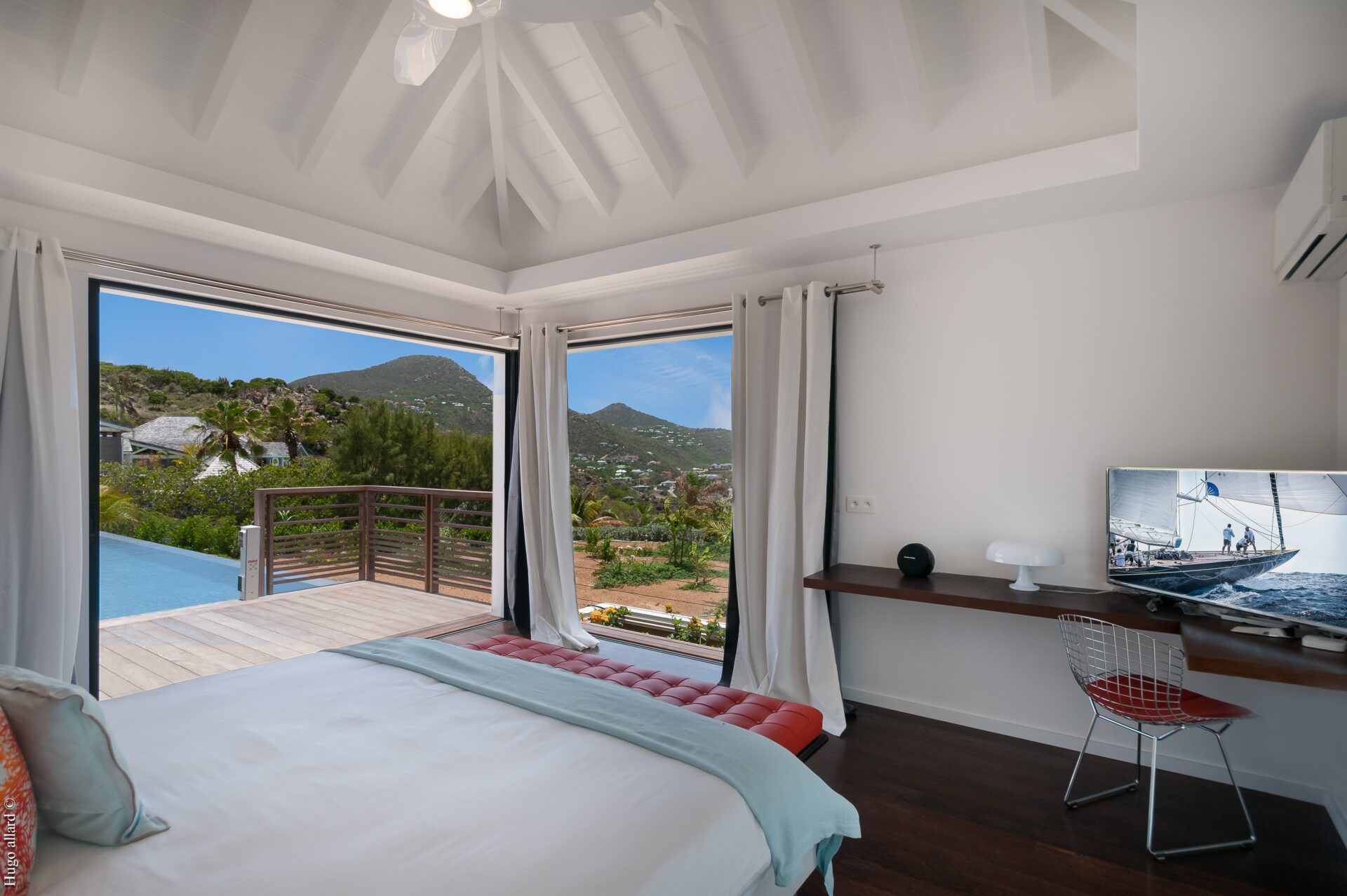 Na sala principal, podemos encontrar a cozinha, sala de estar e sala de jantar, abrindo para um espaçoso deck com uma grande piscina e uma bela vista da praia, mar e montanhas.