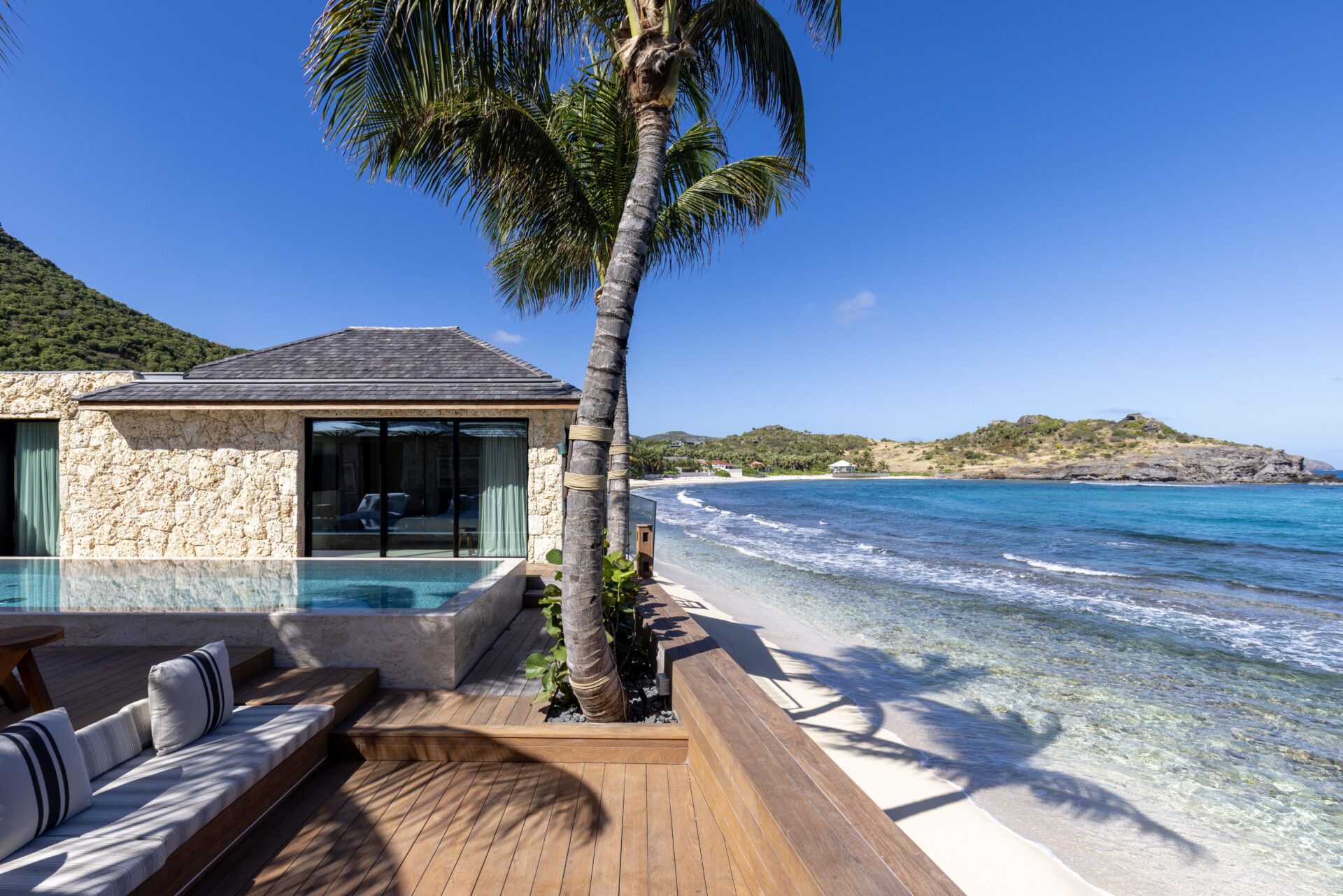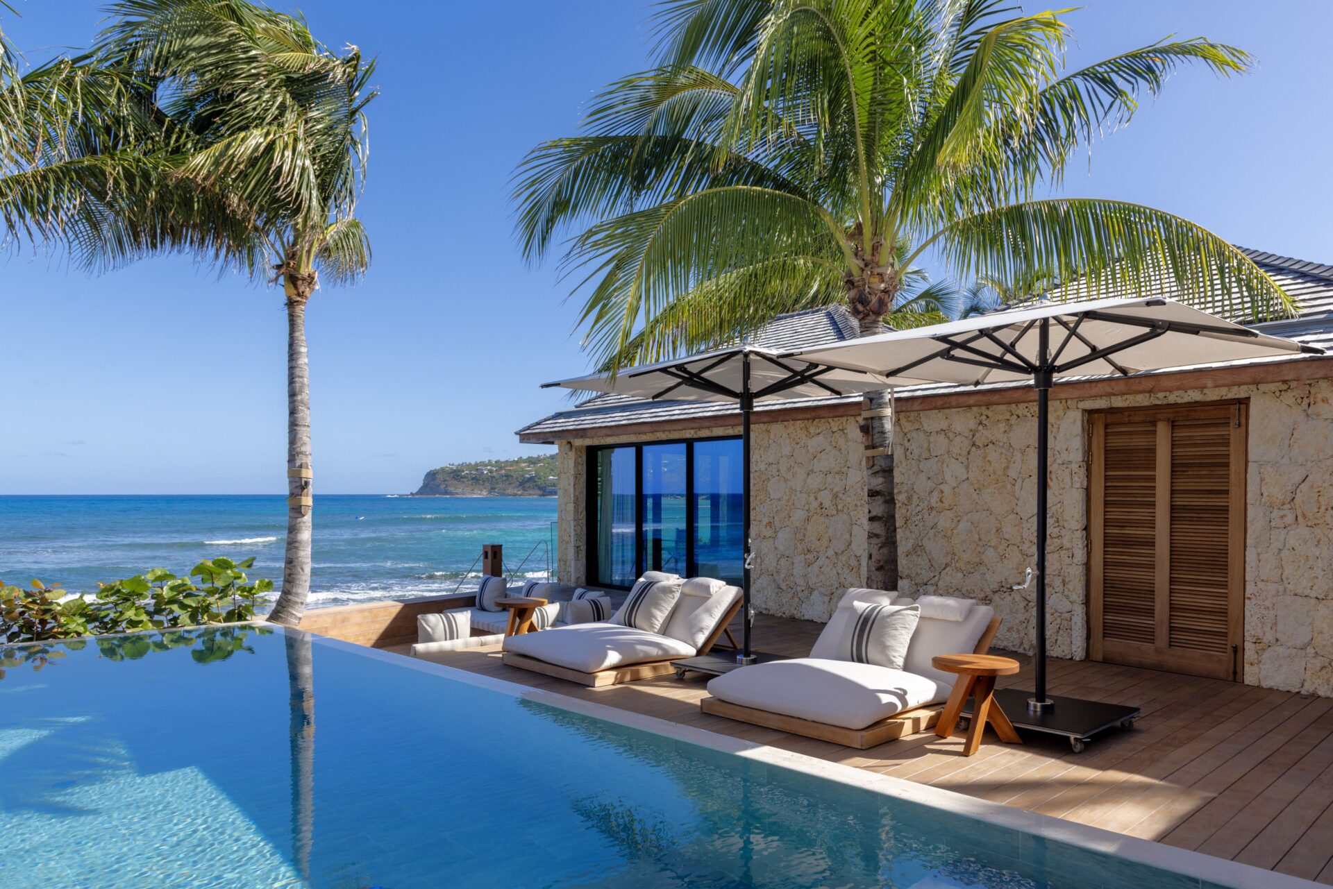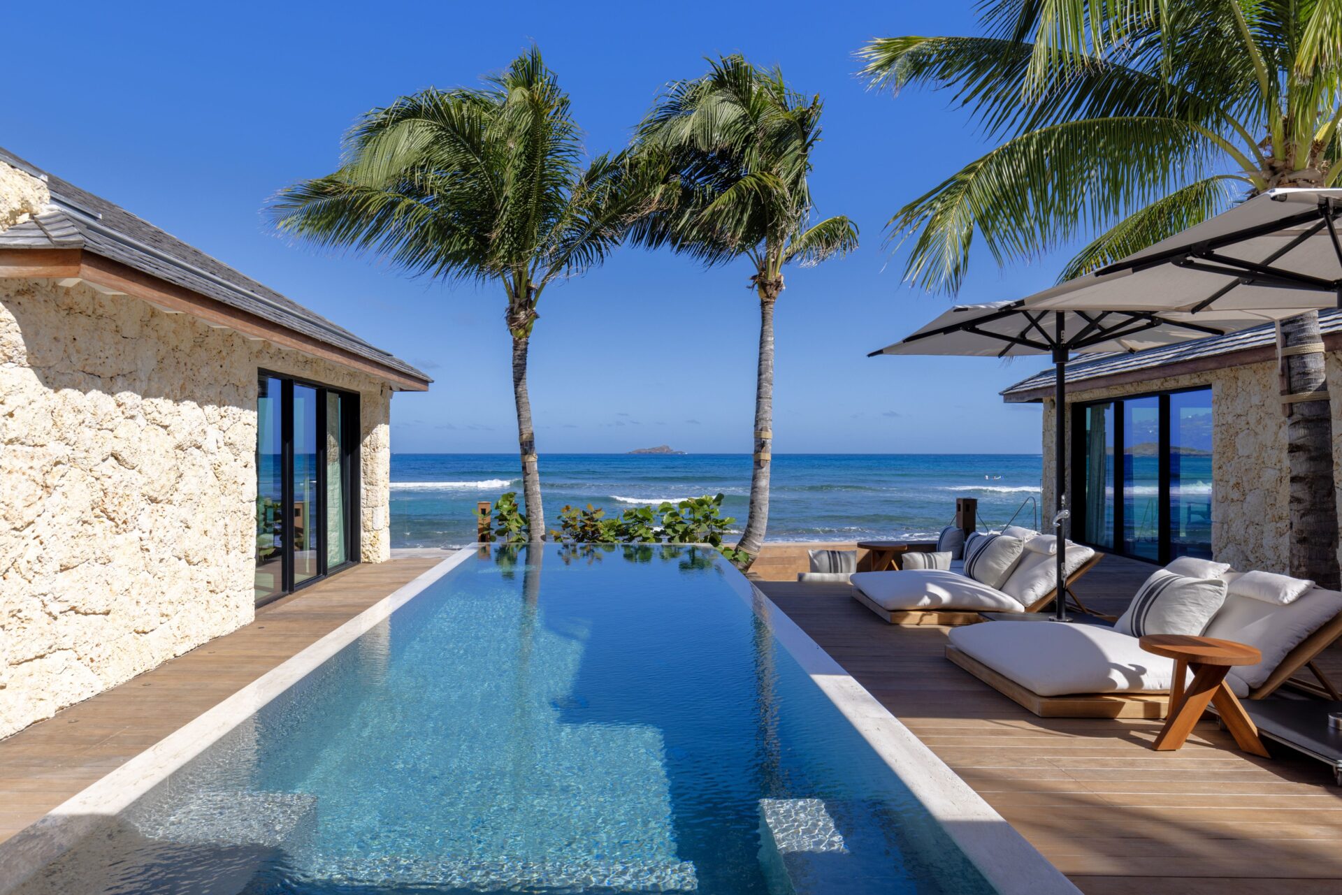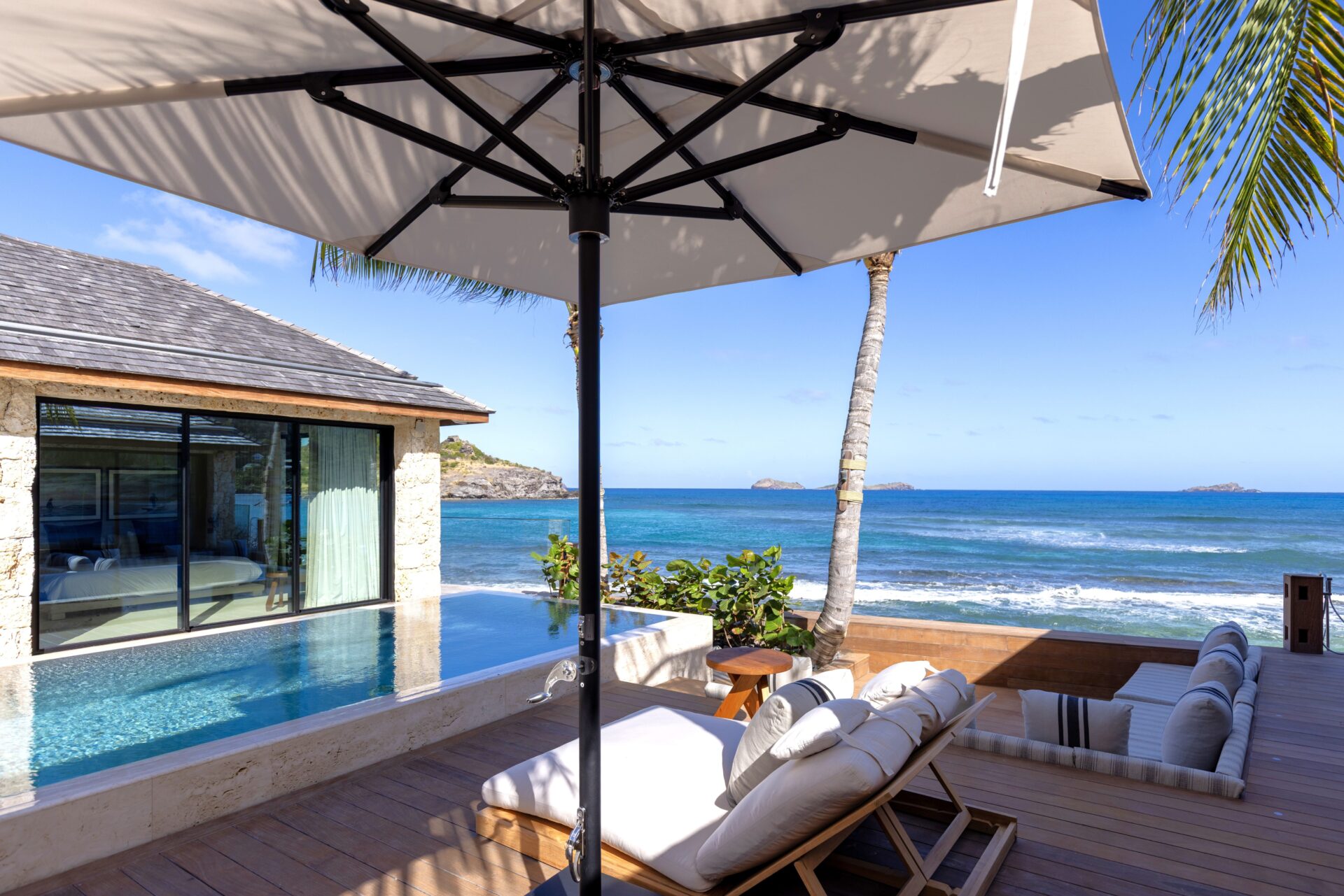 No exterior, com os 4 quartos à sua volta, encontra-se a piscina e deck, e uma zona de estar. Escadas levam diretamente para a praia.