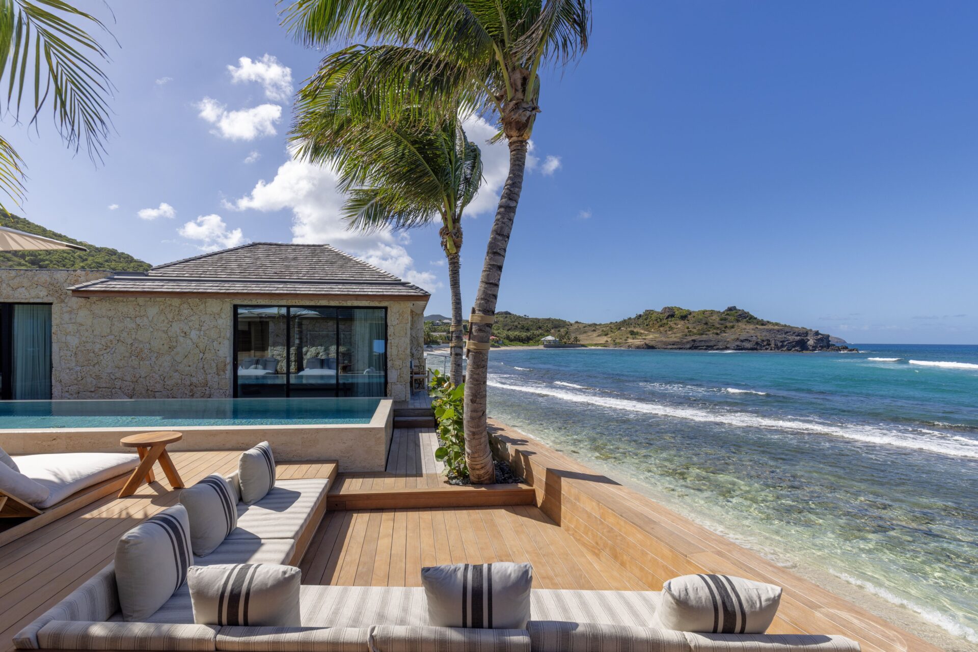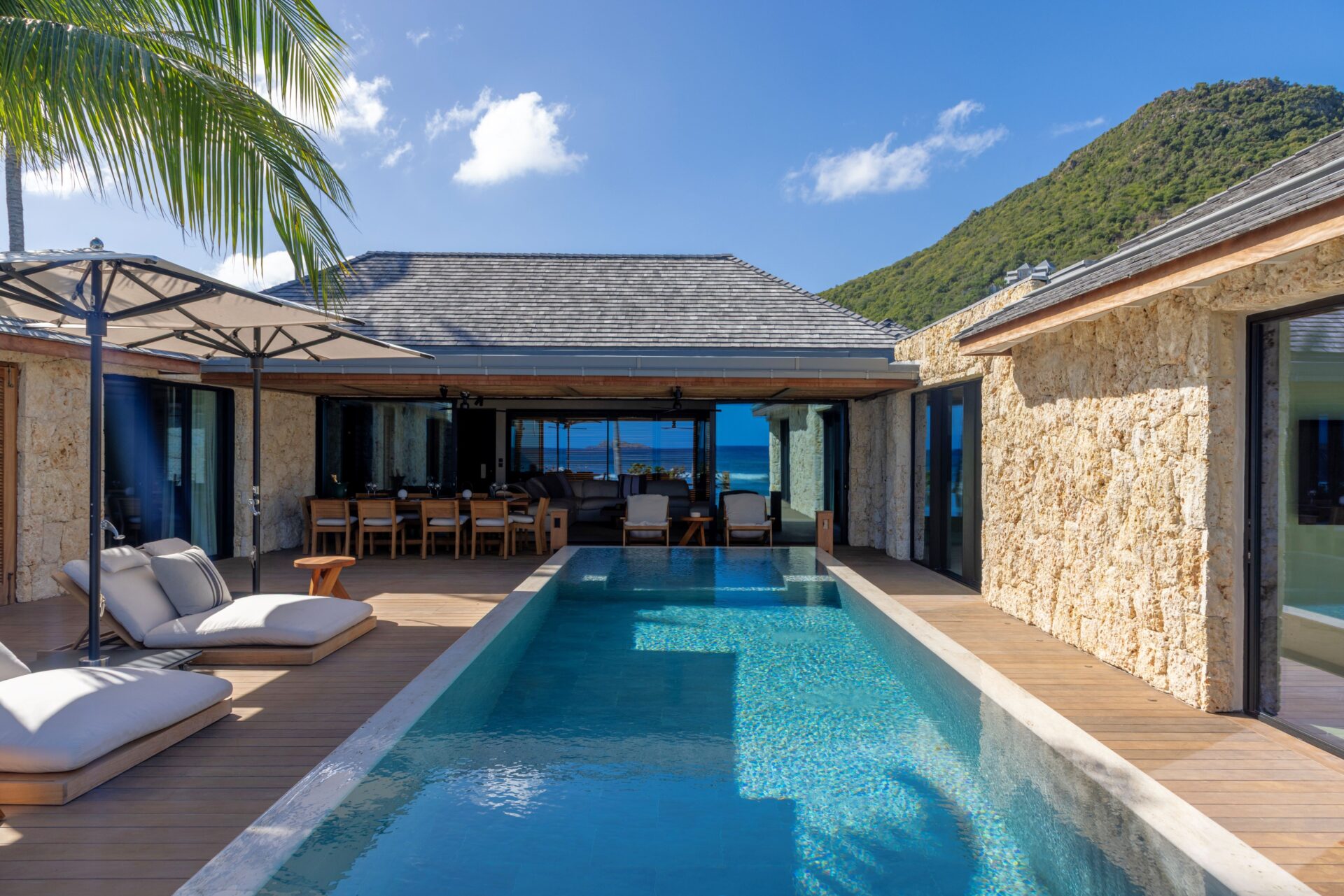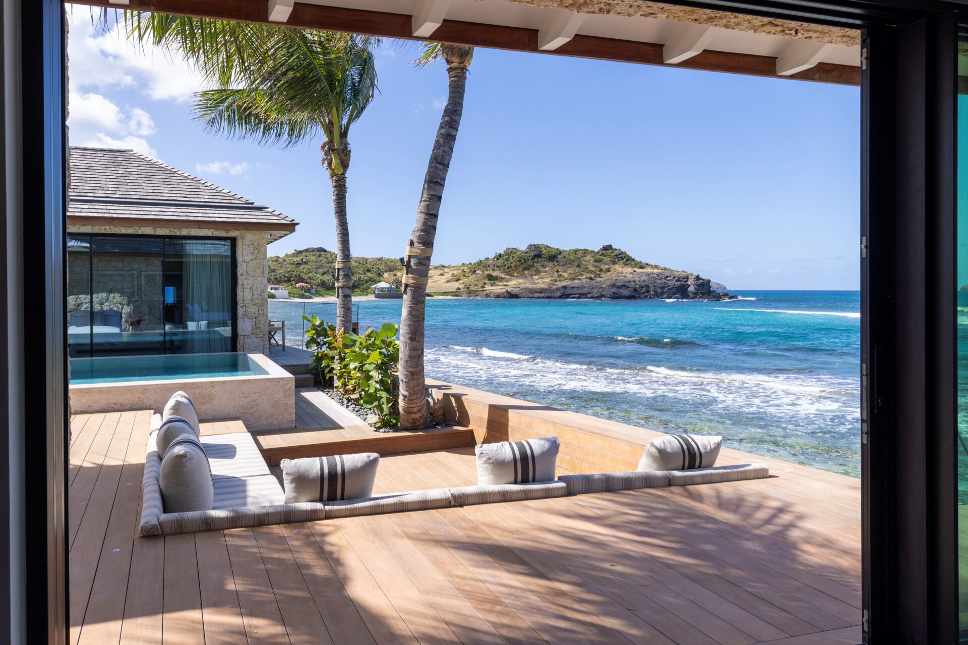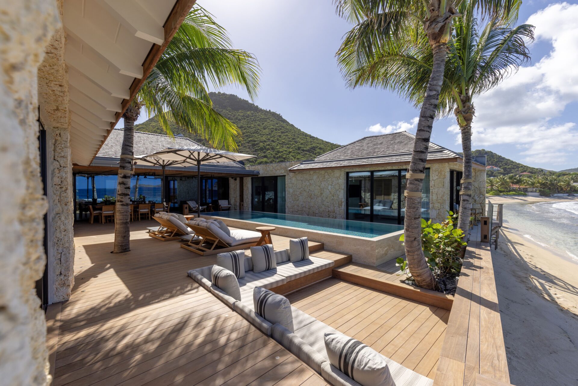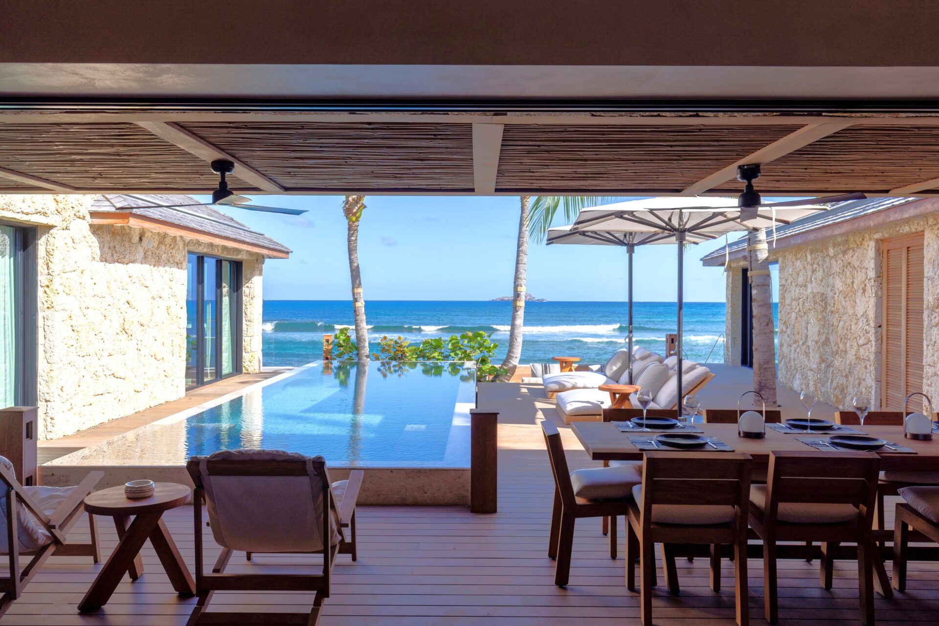 No exterior, com os 4 quartos à sua volta, encontra-se a piscina e deck, e uma zona de estar. Escadas levam diretamente para a praia.