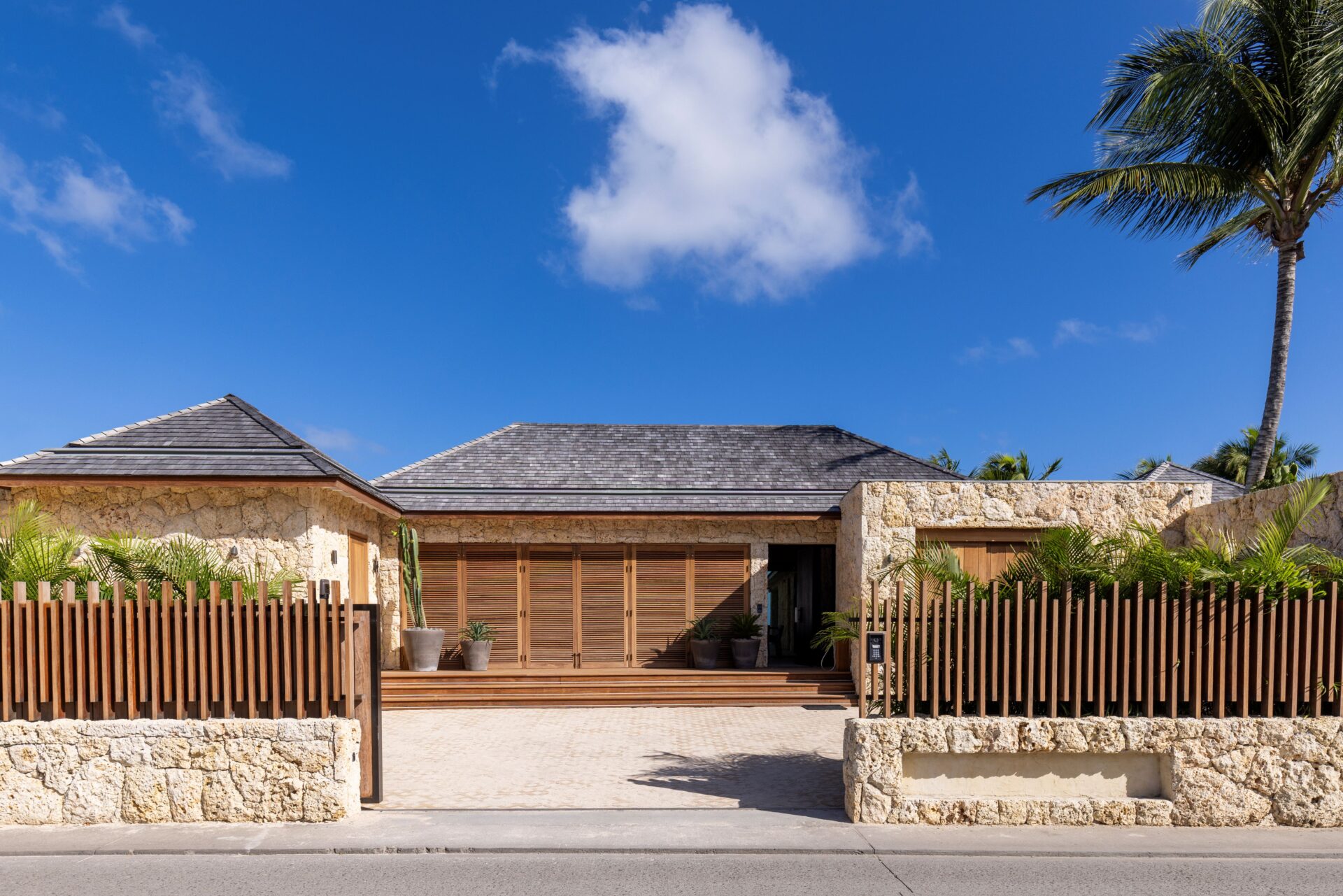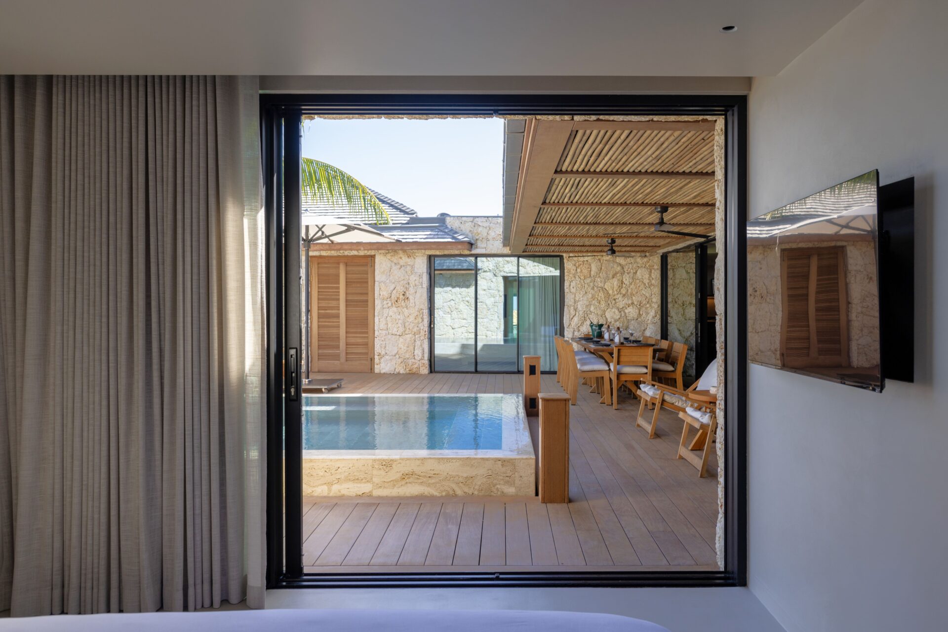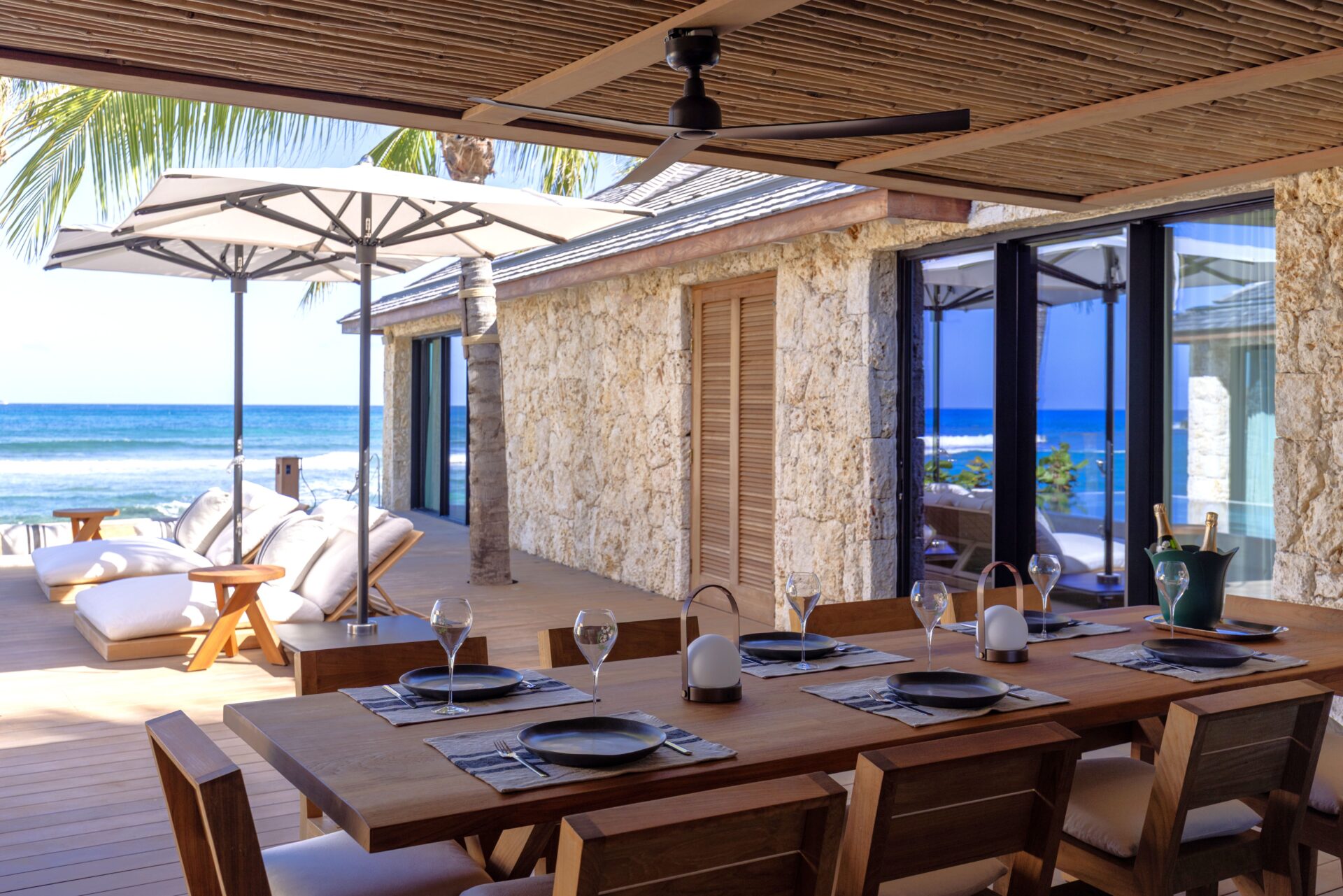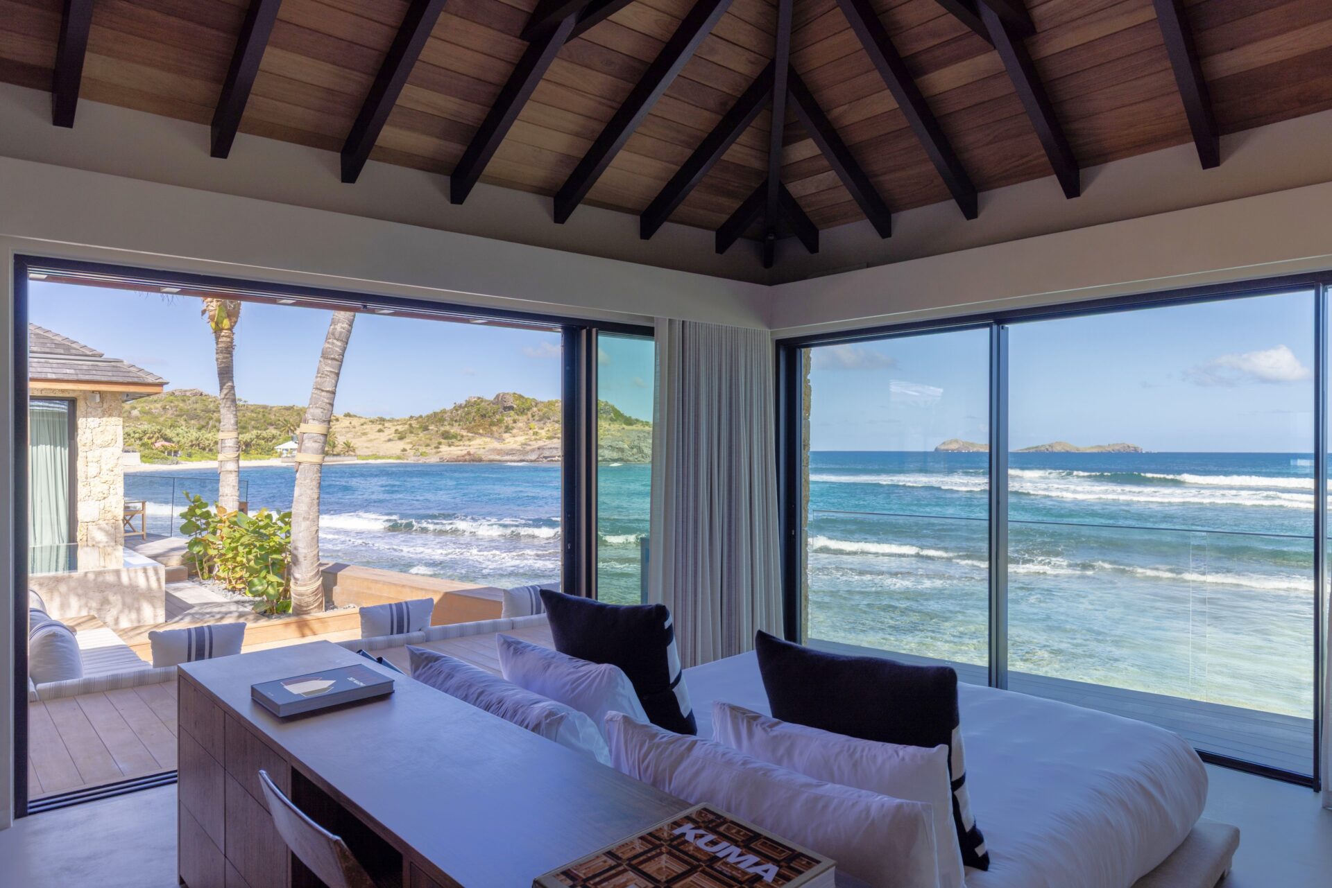 No exterior, com os 4 quartos à sua volta, encontra-se a piscina e deck, e uma zona de estar. Escadas levam diretamente para a praia.
