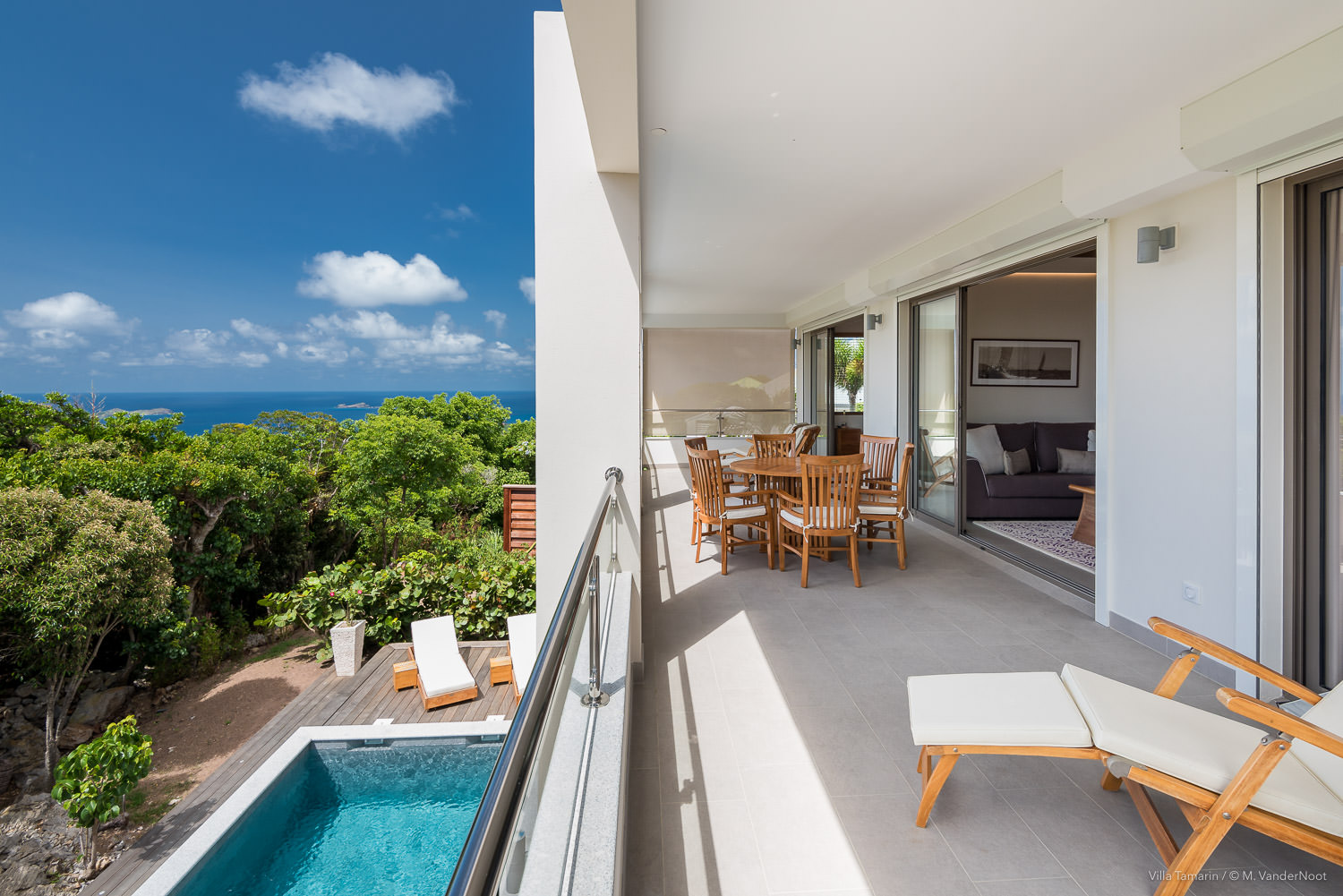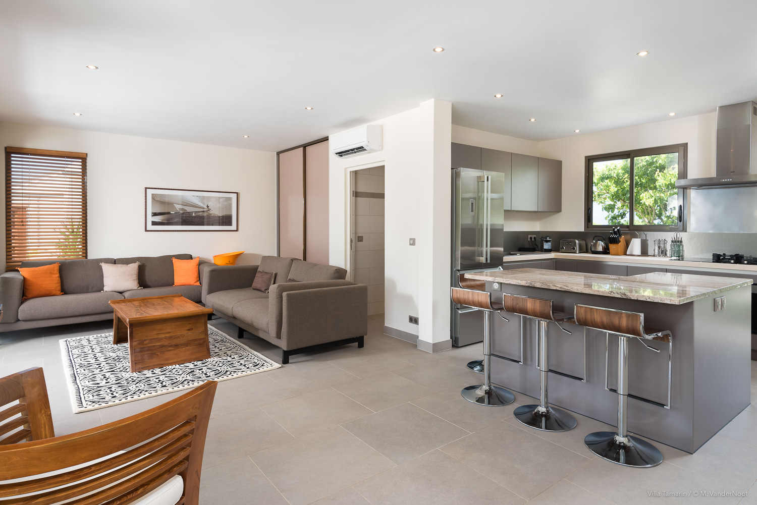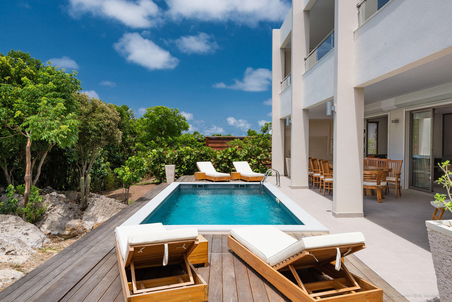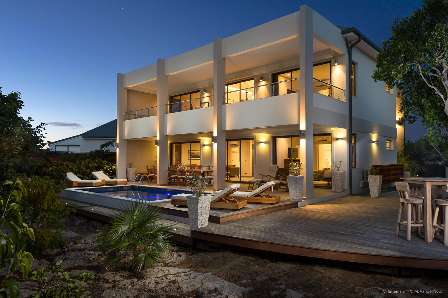 Composta por 1 quarto, sala de estar e cozinha no rés-do-chão, bem como pela área de estar exterior com piscina, e no piso superior, acessível pelo exterior, outra sala de estar com cozinha e 2 quartos.