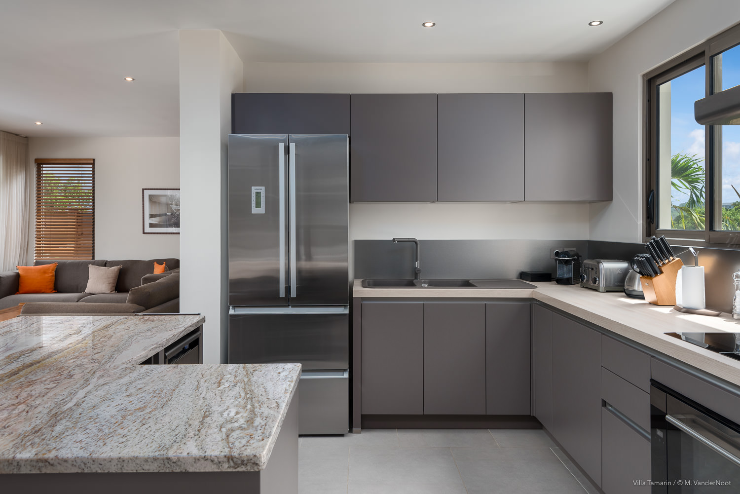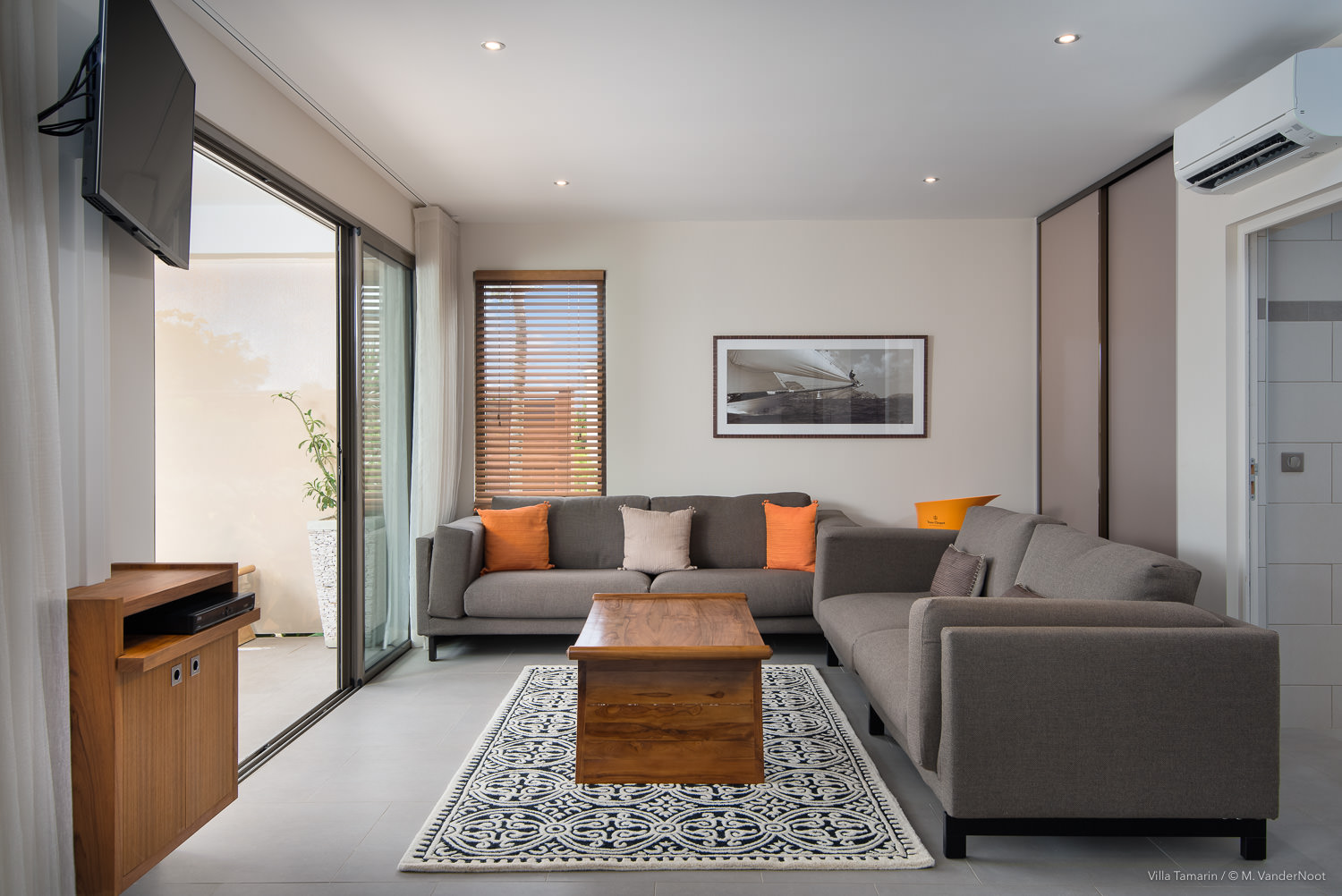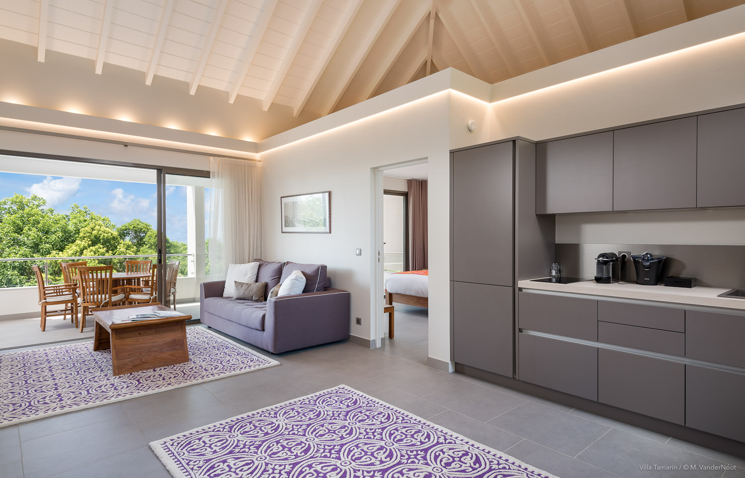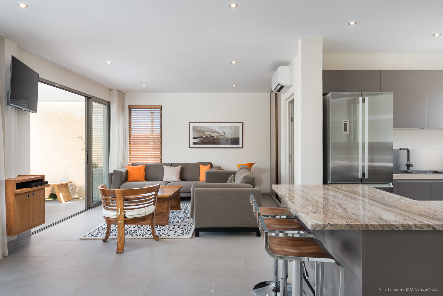 Composta por 1 quarto, sala de estar e cozinha no rés-do-chão, bem como pela área de estar exterior com piscina, e no piso superior, acessível pelo exterior, outra sala de estar com cozinha e 2 quartos.