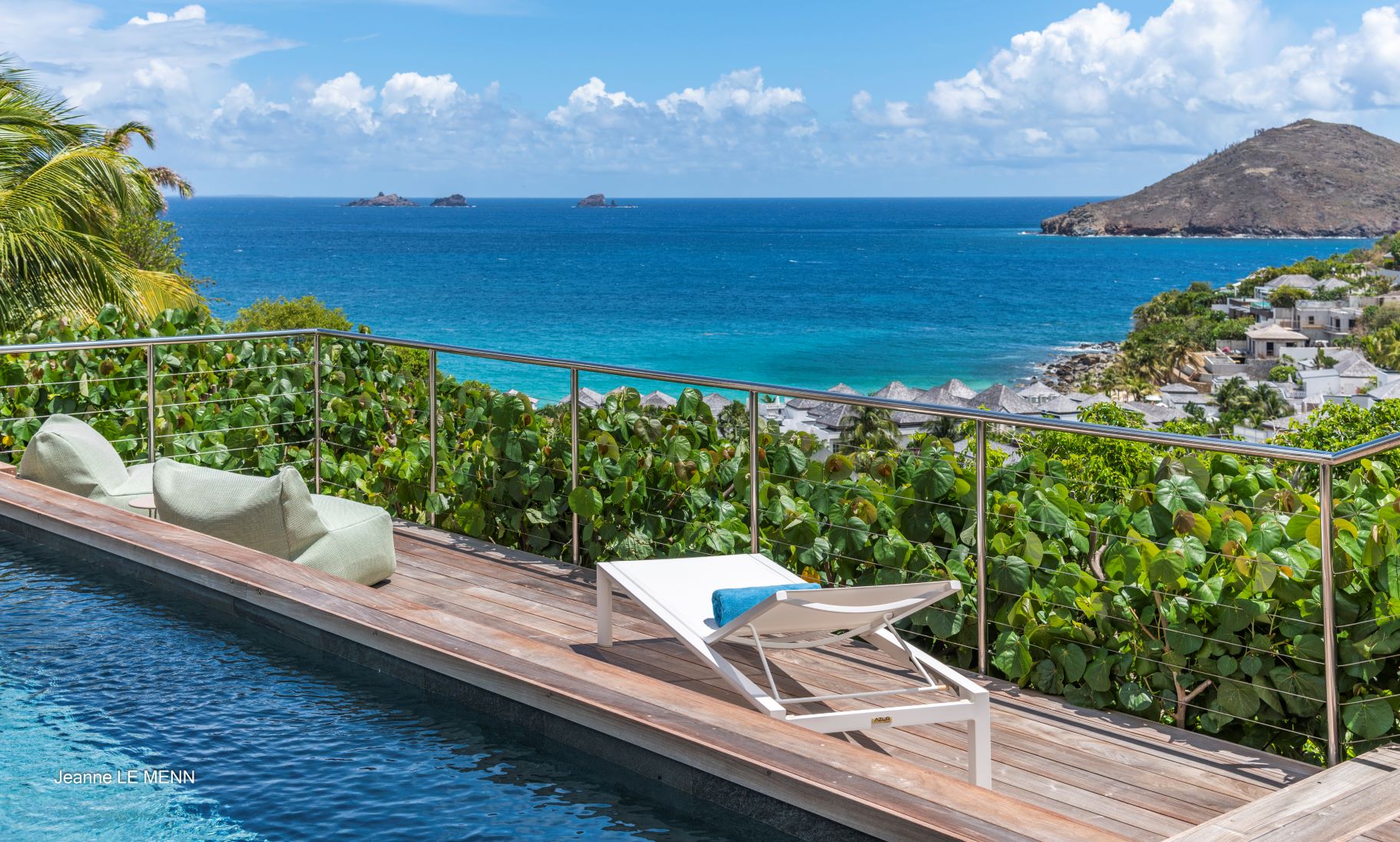 A sala se abre para o terraço e piscina aquecida, em um deck com vista para a praia e o oceano.